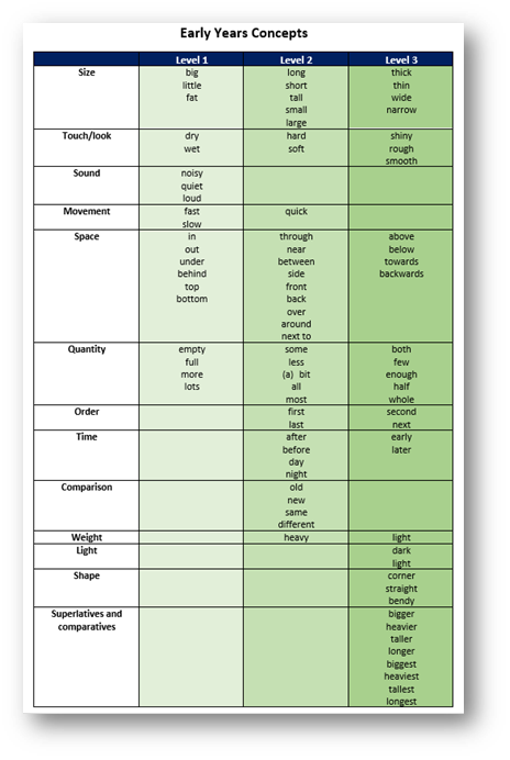 In Nursery and Reception, we ensure that all children have a good understanding of key concept words. Our progression of concepts develops so that by the end of Reception, all children understand the following key concepts: